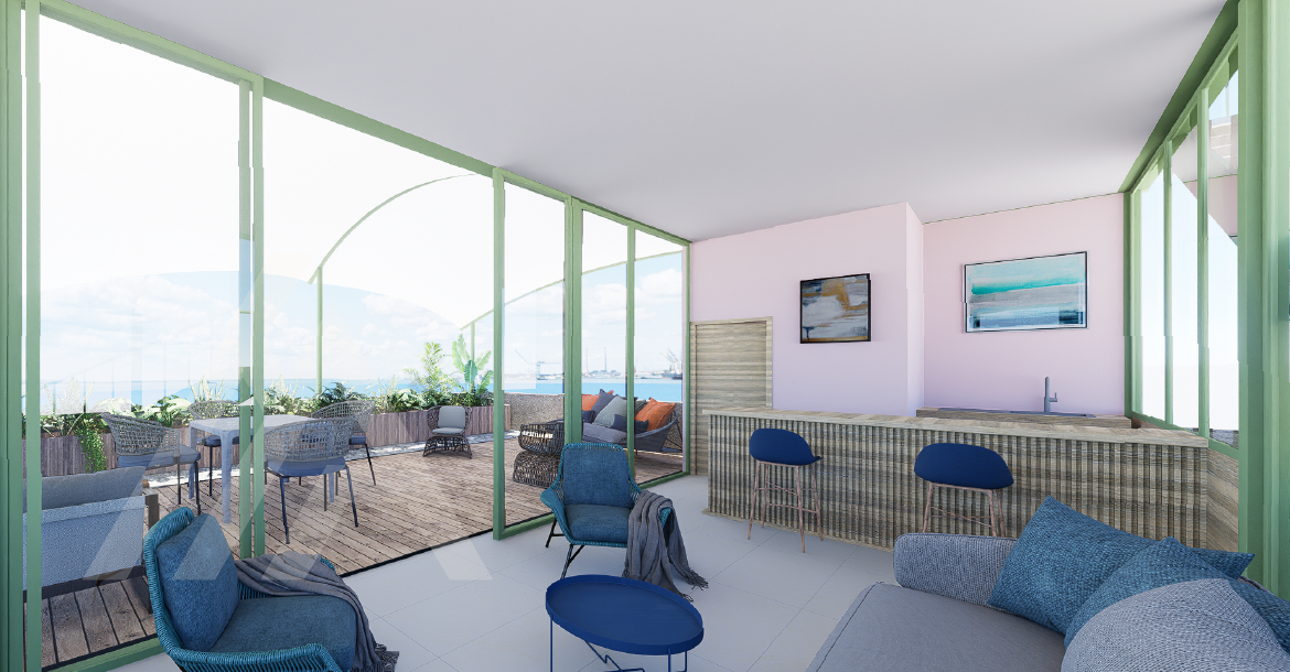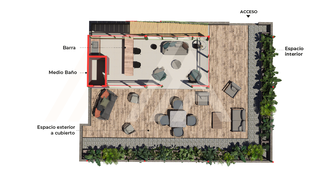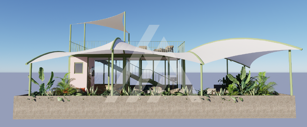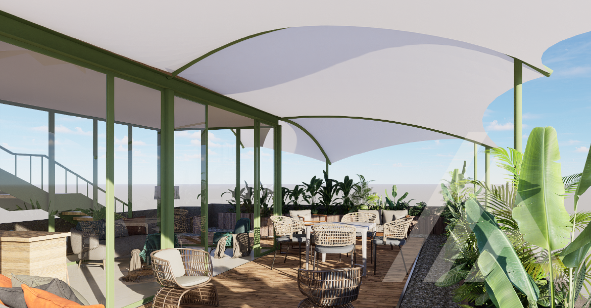 Al interior del loft se encuentra una barra y medio baño para tener lo indispensable para pasar un momento recreacional, mientras que, al exterior, Hormiga Arquitectos propone la colocación de una tensoestructura compuesta de estructura metálica y recubrimiento en membrana PVC, al igual que unas escaleras que conduzcan al piso superior del loft para una terraza adicional con mayor altura que permita a los usuarios tomar el sol o ver el atardecer.